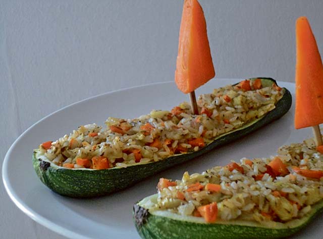 Remove from heat and add to cooked couscous. Stir in feta cheese, herbs, salt and pepper. Place zucchini halves on baking sheet. Scoop couscous mixtures into zucchini halves, stuffing generously and form mounds. Bake for 25 minutes. Remove from oven and carefully place carrot ends on small skewers or toothpicks and stick sails in boats.