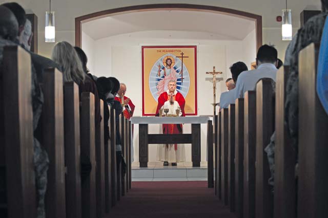 Chaplain (Lt. Col.) Redmond Raux, 86th Airlift Wing Wing Staff Agency chaplain, holds a Catholic Mass in honor of Father (Capt.) Emil J. Kapaun, Medal of Honor recipient, April 11 in the Kapaun Chapel. Kapaun was awarded the medal posthumously for his extraordinary heroism while serving with the 3rd Battalion, 8th Cavalry Regiment, 1st Cavalry Division during combat operations against an armed enemy at Unsan, Korea, and as a prisoner of war from November 1950 to May 1951. In 1993, Kapaun was named a “servant of God” by the Vatican and is currently a candidate for sainthood after two alleged miracles were attributed to prayers for Kapaun to intercede.