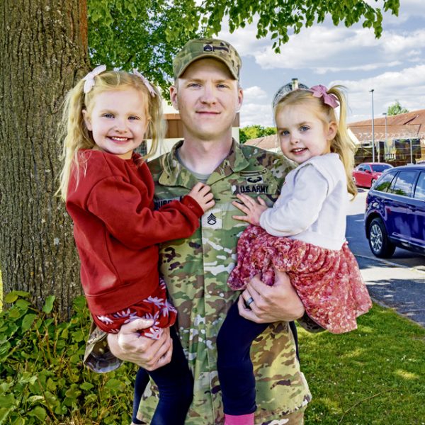 U.S. Army Staff Sgt. Dakota Burd, a human intelligence collector with Headquarters and Headquarters Company, 18th Military Police Brigade, receives a surprise visit from his two daughters, Eloise and Mathilda Burd, at U.S. Army Garrison Bavaria, Germany, May 15, 2025. Soldiers are encouraged to spend time with loved ones to strengthen relationships and maintain balance between work and home life. U.S. Army photo by Sgt. 1st Class Tanisha Karn