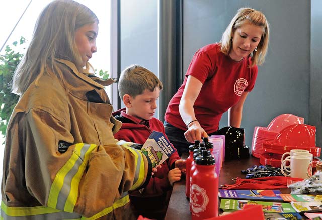 (From left) Hailey, Colton and Jenna Ratlief, family of Senior Airman James Ratlief, 86th Civil Engineer Squadron firefighter, set up souvenirs Oct. 11 during Fire Prevention Week.
