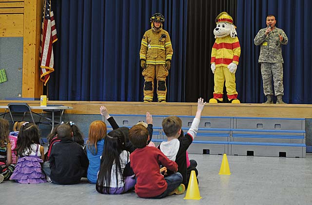 Ramstein Elementary School first graders ask questions about how to prevent kitchen fires and make escape plans for their families Oct. 7 in support of Fire Prevention Week.
