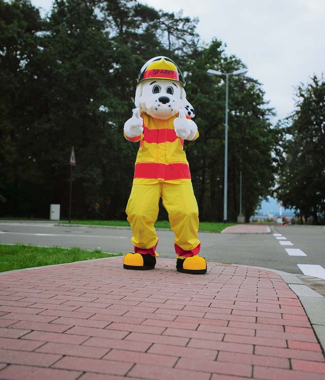 Sparky the fire dog waves to passing drivers at the Ramstein Express gas station Oct. 8 during Fire Prevention Week.
