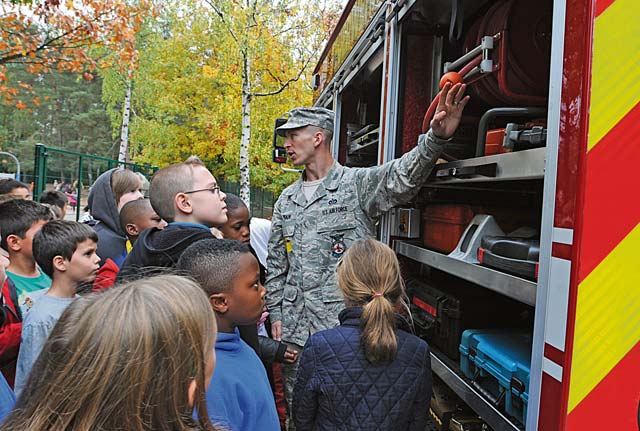 Staff Sgt. Gregory Ullman, 86th Civil Engineer Squadron fire prevention inspector, teaches students about the different parts of a fire truck Oct. 9 during Fire Prevention Week.