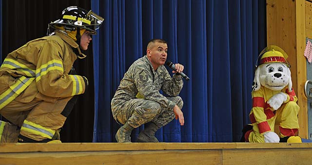 Airman 1st Class Brice Haylett, 86th Civil Engineer Squadron firefighter, Master Sgt. Paul Luevano, 86th CES assistant chief of fire prevention, and Sparky the fire dog demonstrate how to crouch down when there is a fire in the room.
