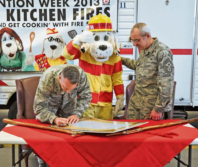 Brig. Gen. Patrick X. Mordente (left), 86th Airlift Wing commander, and Chief Master Sgt. James Morris, 86th AW command chief, sign the 2013 Fire Prevention Week Proclamation Oct. 4 on Ramstein. This year’s theme of Fire Prevention Week is to stress the dangers of kitchen fires.