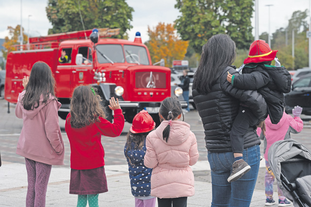 Families gather at the Kaiserslautern Military Community Center for the Fire Prevention Week parade at Ramstein Air Base, Germany, Oct. 21, 2023. This parade was part of Fire Prevention Week, a week-long event hosted by the 86th Civil Engineer Squadron Fire Department to spread awareness of fire safety while cooking this coming holiday season. (U.S. Air Force photo by Senior Airman Andrew Bertain)