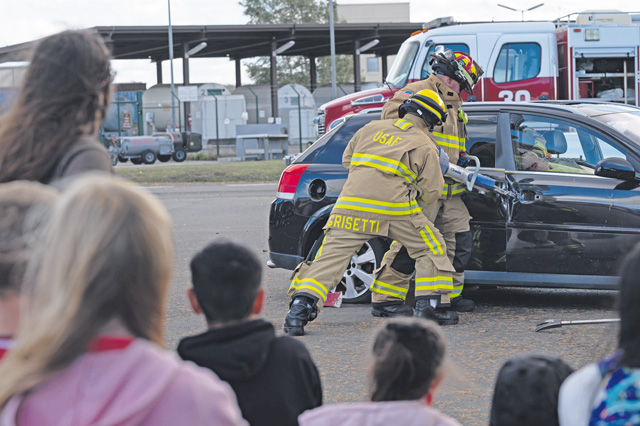 Firefighters from the 86th Civil Engineer Squadron cut open a car during an open house at Ramstein Air Base, Germany, Oct. 21, 2023. The open house was the final event of Fire Prevention Week, a week-long event hosted by the fire department to spread awareness of fire safety and prevention. (U.S. Air Force photo by Senior Airman Andrew Bertain)