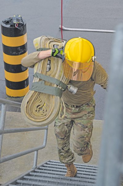 A U.S. Air Force Airman carries a fire hose up stairs in a fire muster competition at Ramstein Air Base, Germany, Oct. 20, 2023. The fire muster gave Airmen the opportunity to put their physical skills to the test in activities firefighters do every day. This competition was part of Fire Prevention Week, a week-long event hosted by the 86th Civil Engineer Squadron Fire Department to spread awareness of fire safety while cooking this coming holiday season. (U.S. Air Force photo by Senior Airman Andrew Bertain)
