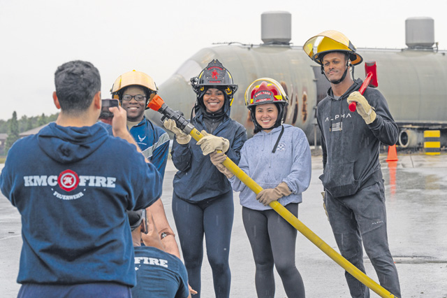 U.S. Air Force Airmen participate in a fire muster competition at Ramstein Air Base, Germany, Oct. 20, 2023. The competition was part of Fire Prevention Week, a week-long event hosted by the 86th Civil Engineer Squadron Fire Department to spread awareness about fire safety and prevention. (U.S. Air Force photo by Senior Airman Andrew Bertain)
