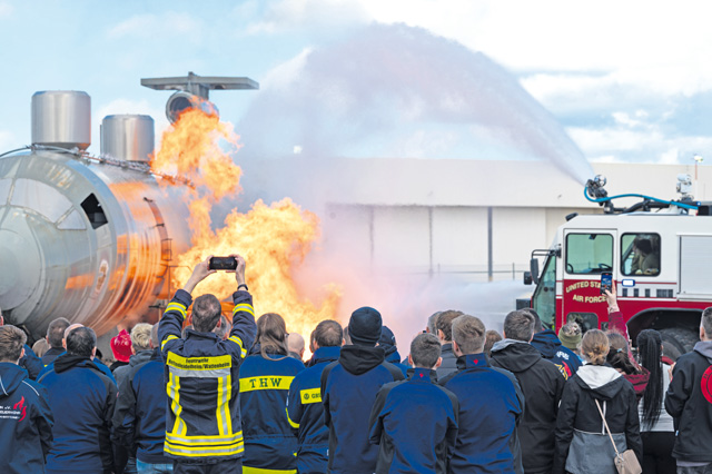 Members of the 86th Civil Engineer Squadron showcase their abilities to put out a fire on a training aircraft while hosting an open house at Ramstein Air Base, Germany, Oct. 21, 2023. The 86th CES invited the Kaiserslautern Military Community and local partners to the open house to spread awareness of fire safety while cooking this coming holiday season. (U.S. Air Force photo by Senior Airman Andrew Bertain)