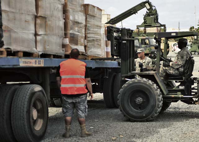 Noncommissioned officers assigned to the 21st Theater Sustainment Command’s Regional Support Element-United Assistance help contractors download pallets of food and supplies for the Intermediate Staging Area Nov. 22 in Dakar, Senegal.