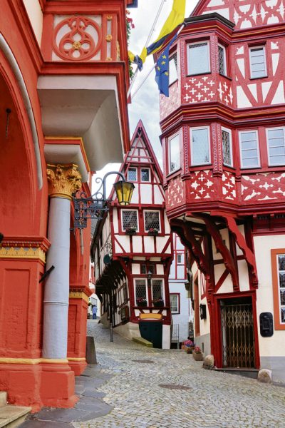 Bernkastel-Kues is a well-known winegrowing center on the Mosel River. The town sits in the valley along the river overlooked by vineyards and a castle. We’ve been there every fall for their Wine Festival that ends with fireworks over the castle. The downtown area is a medieval market place zone strictly for pedestrians. Some of the houses, dating as far back as the 15th century, are a little crooked yet have stood the test of time while others are a bit more spacious. There are plenty of little stores, pubs and cafes.