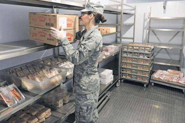 Airman 1st Class Amanda Jolly, 786th Force Support Squadron services shift leader, stocks flight meals for Airmen July 23 on Ramstein. The 786th FSS provides flight meal support for worldwide missions and also ground missions locally. The squadron supplies approximately 250 meals a day, but during the busiest times of the year, they supply around 1,000 meals on an average day. With a small staff, the flight kitchen is able to complete the mission despite many variables, such as an increase in world events. They also provide MRE (meals ready to eat) support to units and accomplish stock room operations to keep the mission running smoothly.