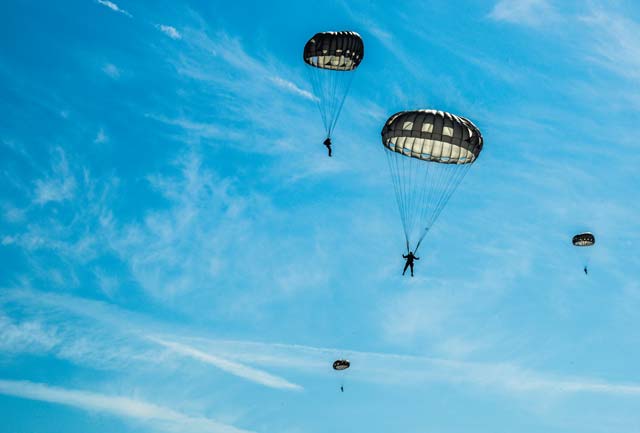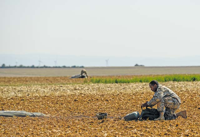 More than 20 Air Force independent duty medical technicians, security forces members and Army Special Forces paratroopers descended from a roaring 86th Airlift Wing C-130J Super Hercules onto the Alzey drop zone in Germany after opening their parachutes.