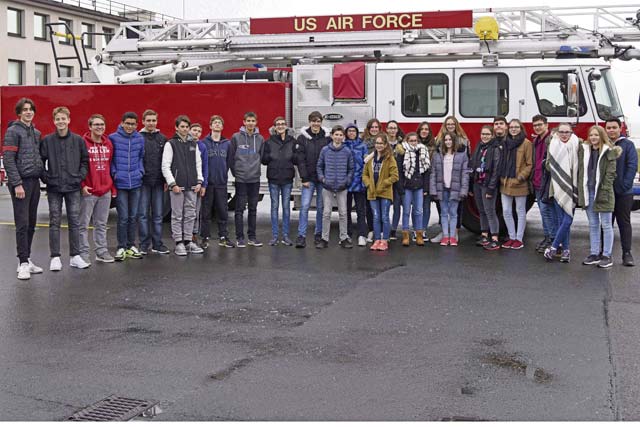 Students from the College de Brumath, Brumath, France, pose for a photo outside the 86th Civil Engineer Squadron’s Fire Department Nov. 17 on Ramstein. The students traveled two hours from France to get a tour of the base. — Photo by Airman 1st Class Milton Hamilton Jr.