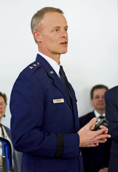 U.S. Air Force Major General Derek C. France, Kaiserslautern Military Community commander, speaks at the 20th-anniversary celebration of the German American Community Office in Kaiserslautern, Germany, April 21, 2023. France is the military representative for the U.S. Army and Air Force to the city of Kaiserslautern and the community. (U.S. Air Force photo by Airman 1st Class Kaitlyn Oiler)