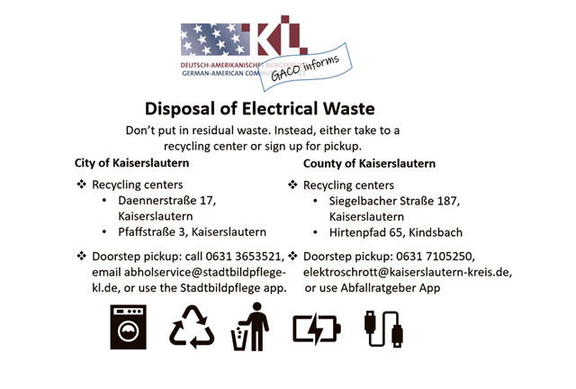 If you live in the county of Kaisers-lau-tern, you can take your electrical waste to their recycling centers or schedule a pickup service by phone at 0631 7105250 or by email at elektroschrott@kaiserslautern-kreis.de or via the Abfallratgeber Landkreis Kaiserslautern app.