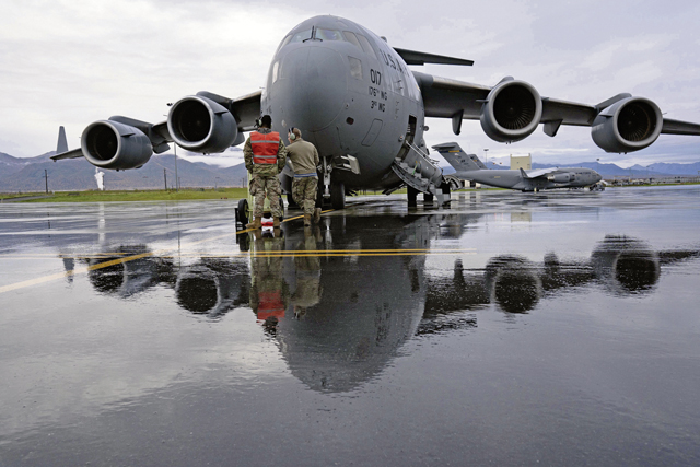 Alaska Air National Guardsmen assigned to the 176th Airlift Wing prepare a C-17 Globemaster III for departure at Joint Base Elmendorf-Richardson, Alaska, Sept. 21, 2022. Approximately 100 members of the AKOM, which includes members of the Alaska National Guard, Alaska State Defense Force and Alaska Naval Militia, were activated following a disaster declaration issued Sept. 17 after the remnants of Typhoon Merbok caused dramatic flooding across more than 1,000 miles of Alaskan coastline. (U.S. Air Force photo by Airman 1st Class Julia Lebens)