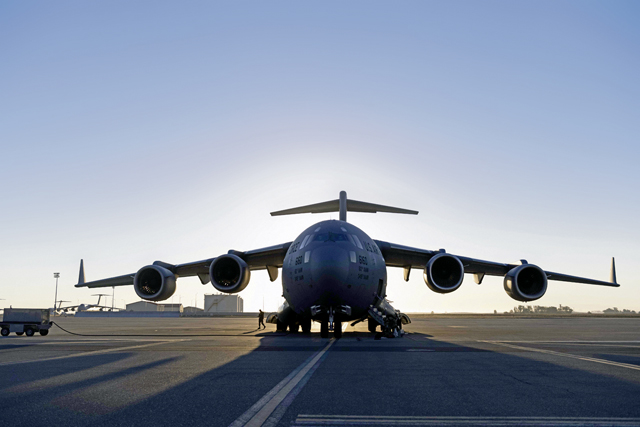 A U.S. Air Force C-17 Globemaster III sits on the flight line at Travis Air Force Base, California, Sept. 23, 2022. A Reserve aircrew from the 301st Airlift Squadron performed a three-day mission Sept. 23 – 25, to move humanitarian cargo to Haiti. Through the Denton Program, three school buses donated from San Diego Unified School District were transported from March Air Reserve Base, California, to Haiti. (U.S. Air Force photo by Senior Airman Jonathon Carnell)