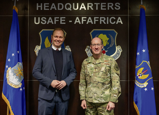 Nils Hilmer, German State Secretary at the Federal Ministry of Defence, and U.S. Air Force Lt. Gen. Jason T. Hinds, commander, U.S. Air Forces in Europe – Air Forces Africa, meet at Ramstein Air Base, Jan. 21. As part of the visit, the leaders discussed bilateral efforts to advance security and military readiness. Photo by Tech. Sgt. Alexandra M. Longfellow