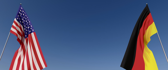 Germany,And,Usa,Flags,On,Flagpoles,On,Blue,Background.,Flags