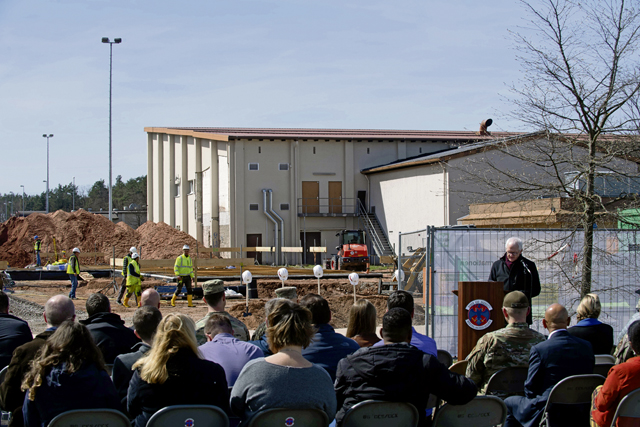 Herr Norbert Hoebel, Landesbetrieb Kaiserslautern director, gives remarks during a groundbreaking ceremony at Kapaun Air Station, Germany, April 11, 2022. The project is providing a new 15,120 square foot facility for Military Family Housing operations, with workspaces for MFH personnel and customer waiting areas. (U.S. Air Force photo by Airman 1st Class Alexcia Givens)