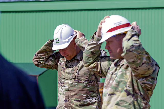 U.S. Air Force Brig. Gen. Josh Olson, 86th Airlift Wing commander, (left) dons a hard hat at a groundbreaking ceremony at Kapaun Air Station, Germany, April 11, 2022. This project will benefit Airmen, Soldiers, and their families with personalized services in the new facility.(U.S. Air Force photo by Airman 1st Class Alexcia Givens)