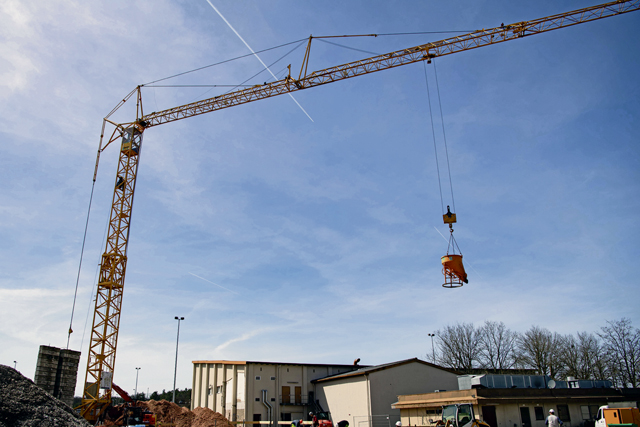 A tower crane is used at the construction site of the Military Family Housing Facility at Kapaun Air Station, Germany, April 11, 2022. The construction project is being managed by the U.S. Army Corps of Engineers, Europe District, which provides design and construction support to the U.S. Air Force in the Kaiserslautern Military Community. (U.S. Air Force photo by Airman 1st Class Alexcia Givens)