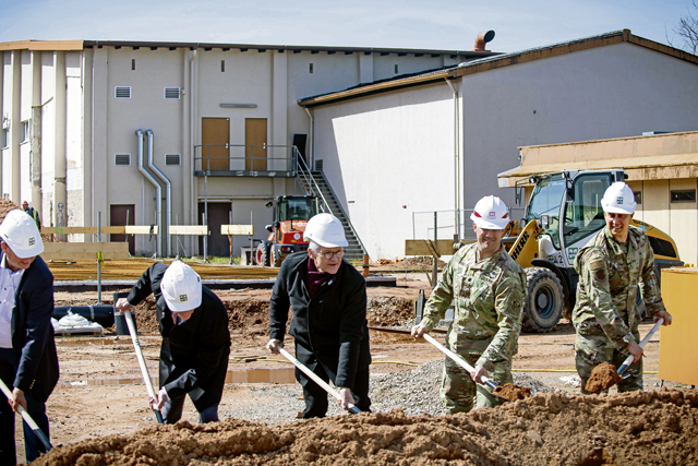 U.S. Air Force Brig. Gen. Josh Olson, 86th Airlift Wing commander, participates in a groundbreaking at Kapaun Air Station, Germany, April 11, 2022. The ceremony included many partners working together to deliver a new top-notch facility to support management of family housing for the Kaiserslautern Military Community. (U.S. Air Force photo by Airman 1st Class Alexcia Givens)