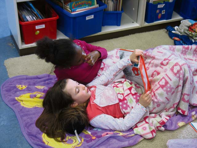 Landstuhl Elementary/Middle School students Ashlee Comfort and Trinity Shimmer read the book “Green Eggs and Ham,” by Dr. Seuss, in Julie Wittenberg’s first grade classroom during National Read Across America Day.