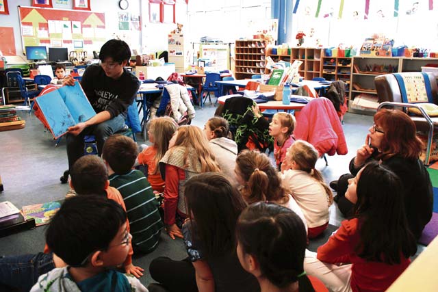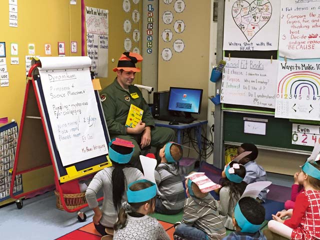 Tech. Sgt. Chris Vanwy, 603rd Air Operations Center, reads to Vogelweh Elementary School students on National Read Across America Day.