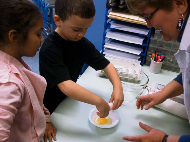 Landstuhl Elementary/Middle School students Kyra Querido and William Moreau make green eggs and ham in Julie Wittenberg’s first grade classroom during National Read Across America Day.