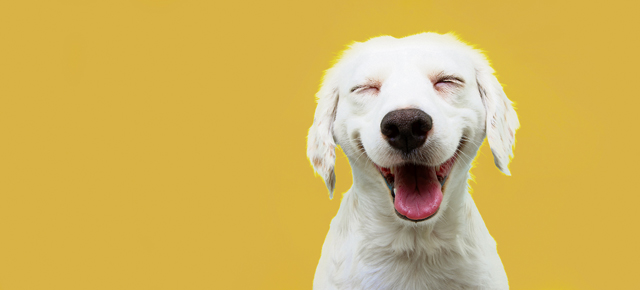 Happy,Puppy,Dog,Smiling,On,Isolated,Yellow,Background.
