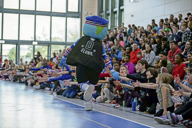 Globe, the Harlem Globetrotters mascot, high-fives children in a crowd at Ramstein Air Base, Germany, March 24, 2023. The Harlem Globetrotters, brought to RAB by Armed Forces Entertainment, put on two shows with an opportunity for members to greet the players after each game. (U.S. Air Force photo by Airman 1st Class Jordan Lazaro)