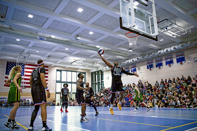 A Harlem Globetrotters player dunks a basketball at Ramstein Air Base, Germany, March 24, 2023. The Harlem Globetrotters beat the Washington Generals in a game brought to RAB by Armed Forces Entertainment. (U.S. Air Force photo by Airman 1st Class Jordan Lazaro)