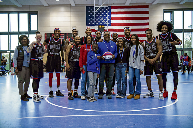 U.S. Air Force Brig. Gen. Otis C. Jones, 86th Airlift Wing commander, and his family pose with the Harlem Globetrotters at Ramstein Air Base, Germany, March 24, 2023. The Harlem Globetrotters visited RAB to play two games against the Washington Generals and provide meet and greet opportunities for the Kaiserslautern Military Community. (U.S. Air Force photo by Airman 1st Class Jordan Lazaro)