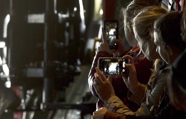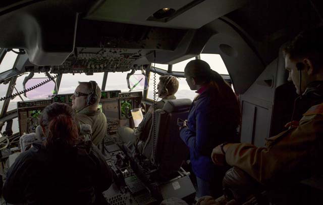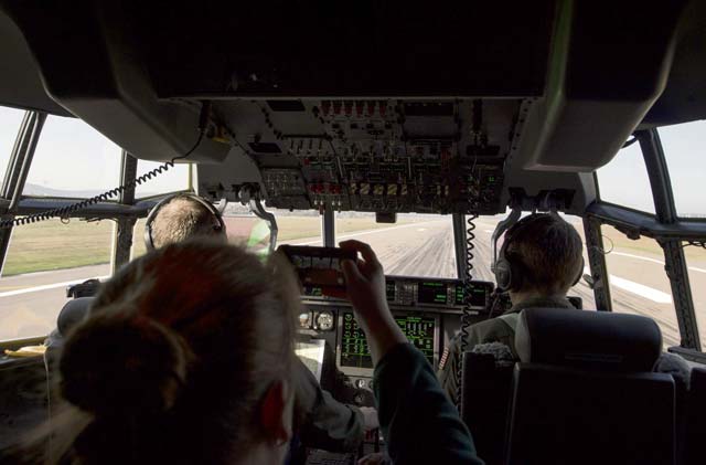The C-130 was flown and manned by pilots and loadmasters from the 37th Airlift Squadron. During the hour-long flight, the spouses were able to visit the flight deck and move around the aircraft to take pictures or ask the crew questions, except for when the ramp door was lowered. At that time, all the participants were required to remain seated with their seatbelts on but could look out the back as the two loadmasters took photos for them on the spouses’ phones.