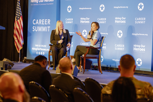 Crystal Kearns, Hiring our Heroes moderator, speaks with Kristy Hogan, Wounded Warrior Project lead, during Hiring our Heroes at Ramstein Air Base, Oct. 17.