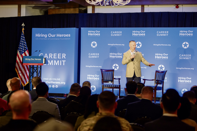 John Wayne Troxell, retired Senior Enlisted Advisor to the Chairman of the Joint Chiefs of Staff, speaks during a Hiring our Heroes event at Ramstein Air Base, Oct. 17. HOH connects the military community such as service members, military spouses and veterans with American businesses to create economic opportunity and a strong and diversified workforce.