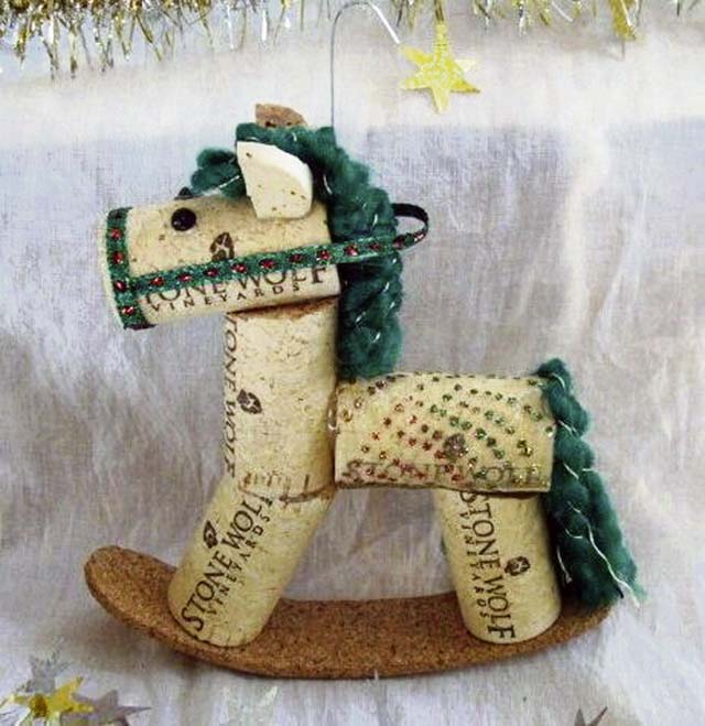 For the high achieving wine crafter, you can go full rocking horse! “Wine cork rocking horse? Oh no, you didn’t!” What will you need for such an ingenious holiday creation? Serrated kitchen knife, hot glue gun, 6 wine corks, fun yarn, cork sheets or thick craft foam, peppercorns or black beads, decorative ribbon, extra decorations as you wish. Isn’t he the cutest? Hang him off a bottle of wine as a gift and – boom – game changer! I don’t even need to give you directions for this guy – just make some cuts on your corks, measure up and hot glue that little guy into cute oblivion!