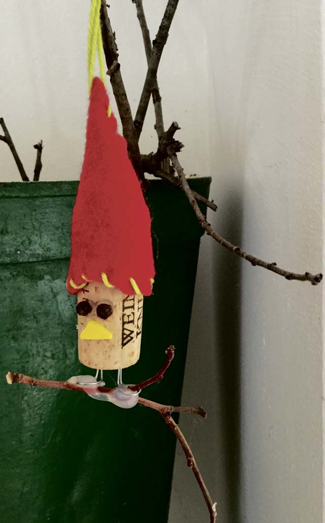 For the beginner, we have this adorable bird. Supplies: serrated kitchen knife, hot glue gun, one cork, a twig, two peppercorns, a piece of craft foam, some gardening wire, felt, needle and thread. Sew a felt hat that fits the cork, keeping an extra piece of thread sticking out the top for hanging; poke the wire in the bottom for feet and hot glue everything else on that little peeper! Et voila! Wine cork bird city!