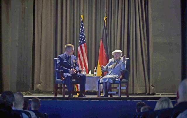 Selma van de Perre, 92-year-old Holocaust survivor, sits with Tech. Sgt. Robert Jarvis, 86th Civil Engineer Squadron firefighter, during a Holocaust remembrance event May 6 on Ramstein. Van de Perre shared her story of surviving Ravensbrueck, a womens concentration camp.