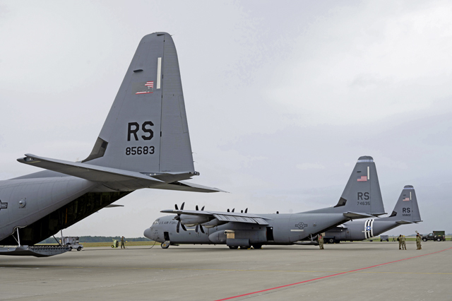 Three C-130J Super Hercules aircraft assigned to the 37th Airlift Wing, prepare for flight during exercise Hussar Saber at 33rd Air Base, Poland, Sept. 8, 2025. Today’s global environment requires the ability to rapidly deploy and sustain operations across great distances. Through joint exercises like Hussar Saber, our forces are forward postured with the resources and infrastructure needed to combat current and future threats. (U.S. Air Force photo by Senior Airman Trevor Calvert)
