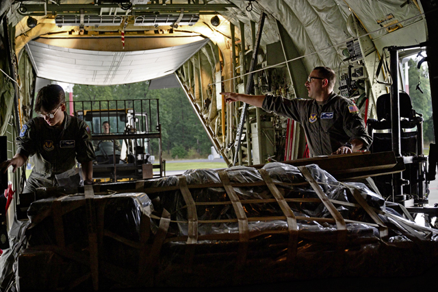 U.S. Air Force Airman 1st Class Natalia Skolyszewski, left, 37th Airlift Squadron loadmaster, and Tech. Sgt. Robert Hutton, 37th AS instructor loadmaster, prepare a pallet for an airdrop aboard a C-130J Super Hercules aircraft during exercise Hussar Saber at 33rd Air Base, Poland, Sept. 8, 2025. Hussar Saber demonstrated the U.S.’s capacity to execute rapid force flow, Agile Combat Employment at scale, and complex and long-lasting sustainment of logistics. (U.S. Air Force photo by Senior Airman Trevor Calvert)