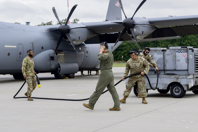 U.S. Airmen assigned to the 86th Airlift Wing prepare a C-130J Super Hercules aircraft for flight during exercise Hussar Saber at 33rd Air Base, Poland, Sept. 8, 2025. Hussar Saber focused on strengthening the ability to rapidly deploy and sustain operations through collaborative work with NATO Allies and partners. Forces were forward postured with the resources and infrastructure necessary to combat current and future threats. (U.S. Air Force photo by Senior Airman Trevor Calvert)