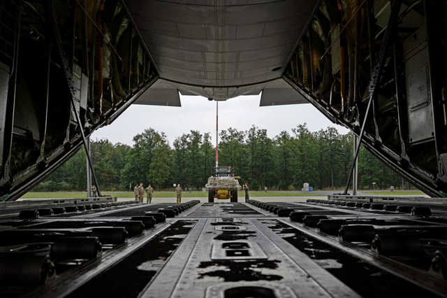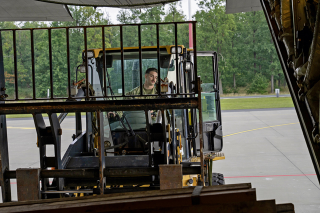 U.S. Air Force Staff Sgt. Ethan Wilson, 86th Logistics Readiness Squadron noncommissioned officer in charge of fuels hydrants, operates a forklift to load cargo into a C-130J Super Hercules aircraft during exercise Hussar Saber at 33rd Air Base, Poland, Sept. 8, 2025. The U.S. employed exercises like Hussar Saber to show its dedication to meeting security commitments to our Allies and partners across the globe, strengthening our collective agility and ability to rapidly respond to any challenges in operational environments. (U.S. Air Force photo by Senior Airman Trevor Calvert)