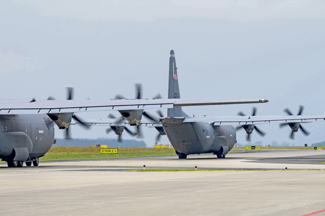 Two C-130J Super Hercules aircraft from Ramstein Air Base, Germany, taxi before takeoff during exercise Hussar Saber at 33rd Air Base, Poland, Sept. 8, 2025. Hussar Saber is a bilateral exercise focused on tactical airlift and airdrop operations meant to build and maintain unit mission readiness and promote interoperability with NATO Allies.(U.S. Air Force photo by Senior Airman Trevor Calvert)