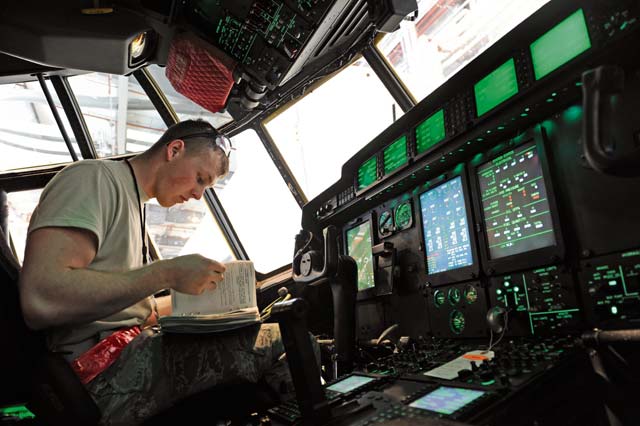 Senior Airman Jacob Osborne, 86th Maintenance Squadron hydraulics systems journeyman, applies electrical power to a C-130J Super Hercules Oct. 21 on Ramstein. In order to check the hydraulic systems before or after a flight, the hydraulics journeymen must turn on the electrical systems and check the hydraulics from the cockpit as well as outside of the aircraft.
