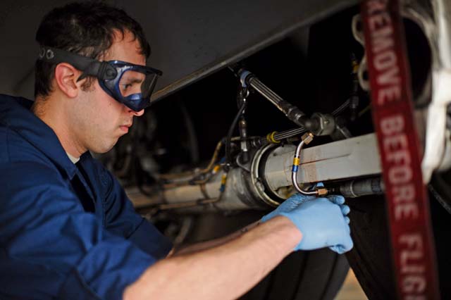 Senior Airman Jacob Osborne, 86th Maintenance Squadron hydraulics systems journeyman, tests a C-130J Super Hercules emergency brake line Oct. 21 on Ramstein. In case the main hydraulics system fails, the emergency line will automatically apply pressure to the brakes, slowing down the aircraft. There are two emergency brake systems on every C-130J Super Hercules.