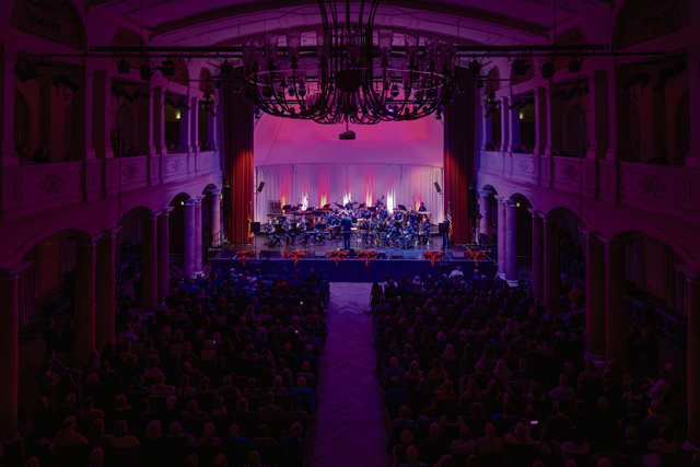 The U.S. Air Forces in Europe – Air Forces Africa band performs during the Kaiserslautern Military Community Christmas concert at the Fruchthalle in Kaiserslautern, Germany, Dec. 12, 2025. Concerts provide an opportunity for building bridges between different communities and fostering mutual understanding through the universal language of music. (U.S. Air Force photo by Senior Airman Edgar Grimaldo)